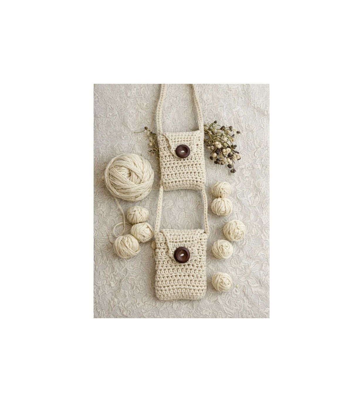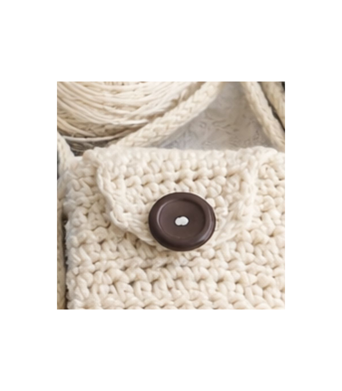 La pochette en crochet conçue par l'une de nos créatrices est en coton bio, matière douce et agréable, avec des boutons en bois uniques.